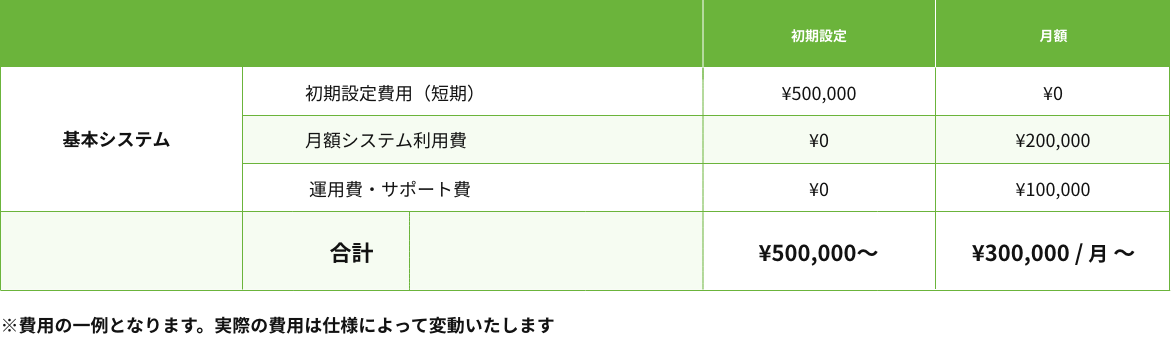 | 基本システム | 初期設定費用(短期) | ¥500,000 | ¥0 | |